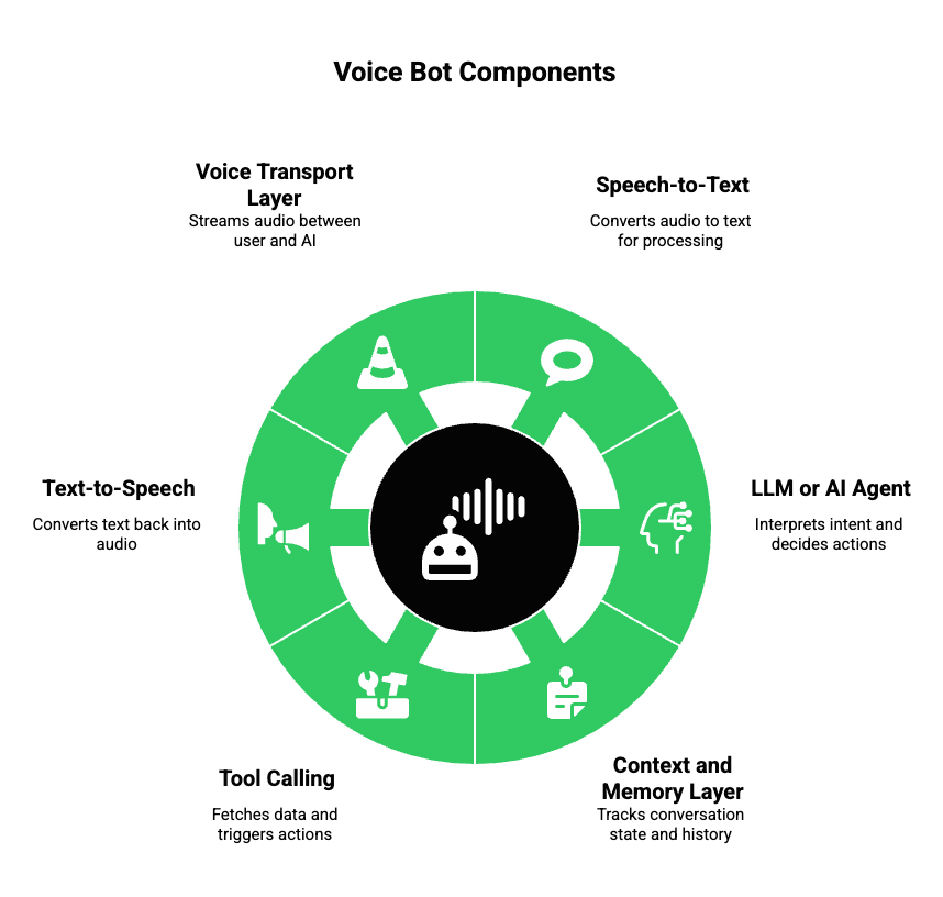 A modern voice bot is not a single tool. Instead, it is a system composed of multiple independent components working together in real time.