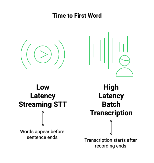 As a result, streaming STT reduces time to first word, which directly improves perceived responsiveness.