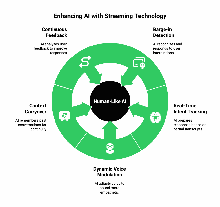 Moreover, streaming unlocks speech-to-speech streaming – where speech goes in and synthesized speech comes out continuously. This capability allows the AI agent to interrupt, clarify, or overlap slightly with human speech, mimicking real conversation.