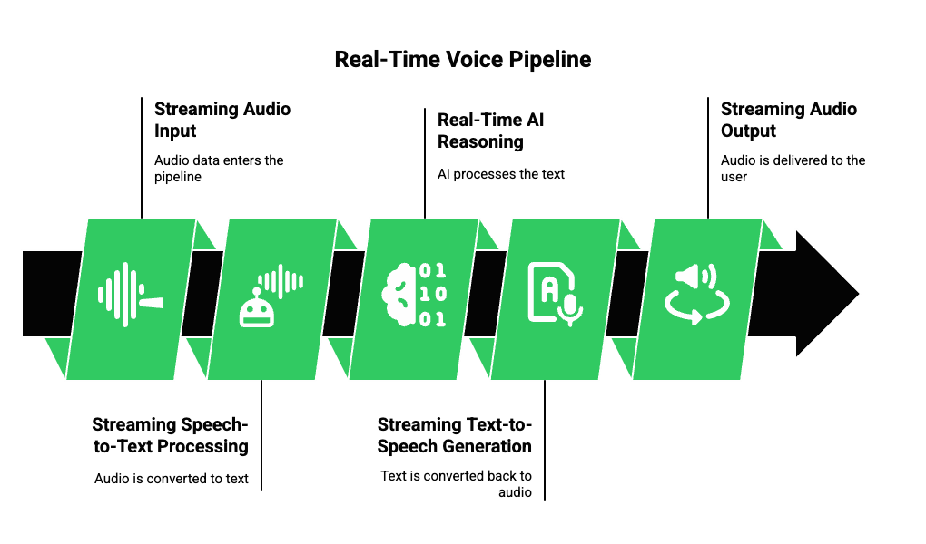 A real-time voice pipeline describes how streaming audio becomes a spoken response.