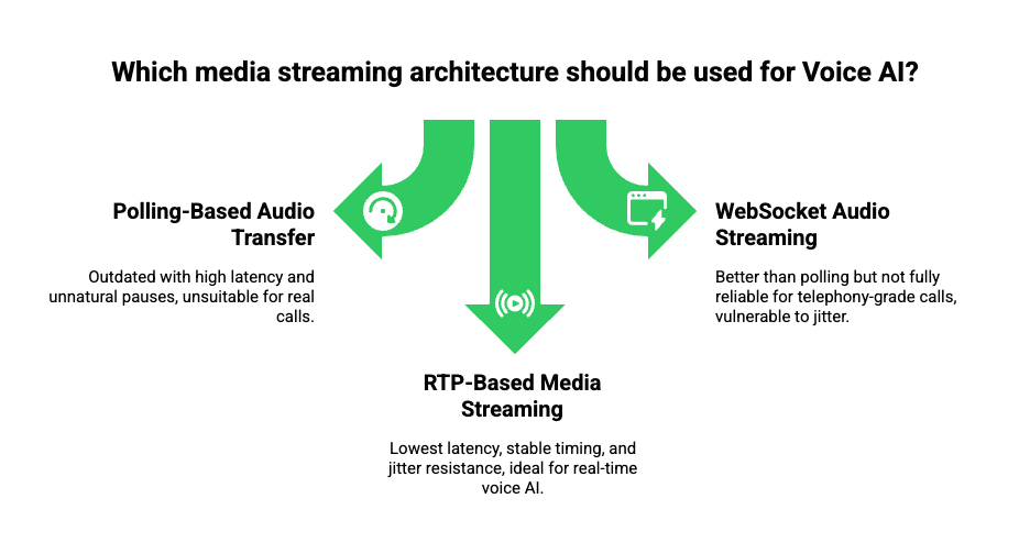 Although AI reasoning has evolved rapidly, latency in audio flow is often the biggest bottleneck in delivering natural, human-like conversations. Even the most advanced LLM fails to feel “intelligent” when audio takes 500–800 ms to reach or respond. Therefore, media streaming acts as the bridge between telephony networks and AI systems, ensuring that speech is captured, transported, converted, processed, and returned in near real time.
