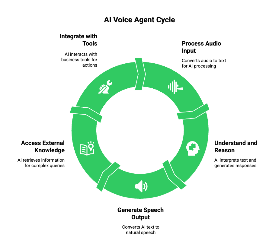 Caller speaks → STT converts audio → LLM processes text → RAG fetches external data → TTS converts response → Caller hears reply