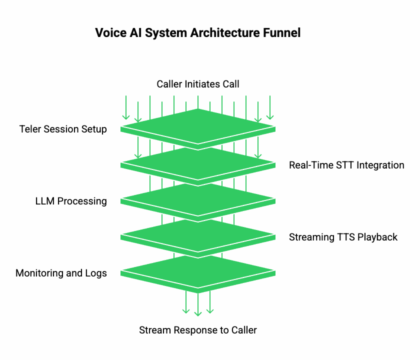 To implement Teler + LLM + STT/TTS, teams can follow this simple yet technically precise structure: