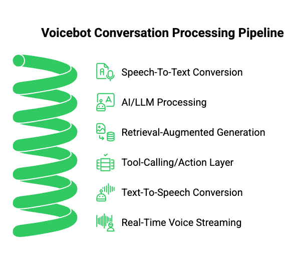 A typical voicebot pipeline includes: