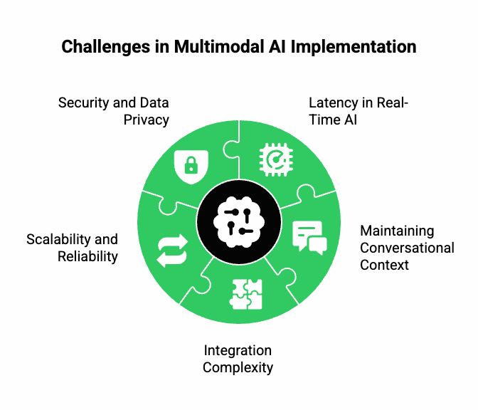 Despite the advantages, implementing multimodal AI agents comes with several technical challenges: