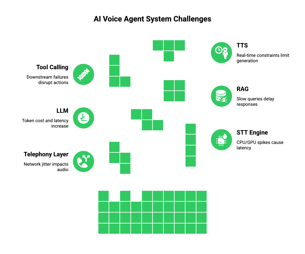 Enterprise systems should be designed for peak concurrency, often 5–10x average traffic, not steady-state usage. - What causes most latency in voice AI systems?