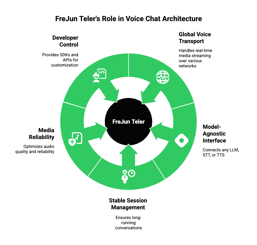 While LLMs can reason and generate responses, they cannot talk on their own. Between a user speaking and an AI replying, multiple systems must work together – media streaming, speech recognition, synthesis, call control, and context management. Therefore, the Voice Chat SDK becomes the backbone of the entire experience.