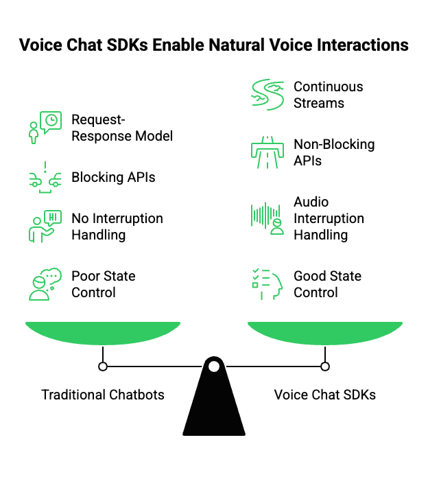 Therefore, if your goal is natural voice interaction, a different architecture is required. This is exactly where a voice chat SDK becomes essential.