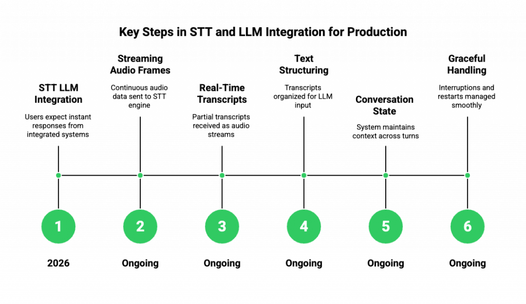 In production environments, STT and LLM integration must be fast, stable, and predictable. This becomes even more important as teams move toward STT LLM integration in 2026, where users expect instant responses.
