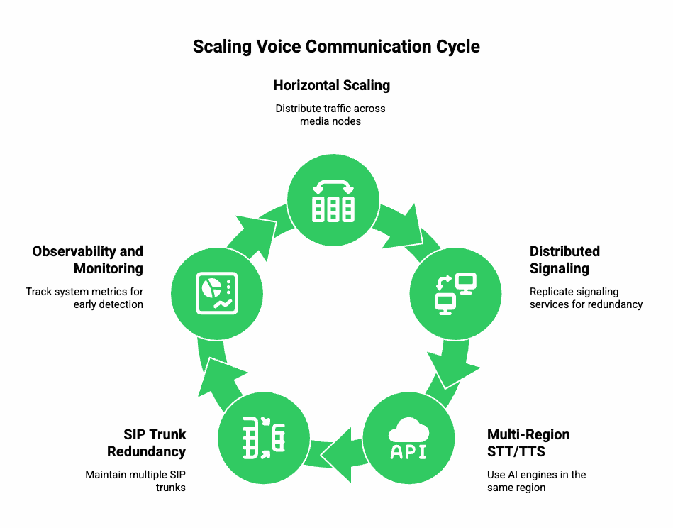 Use elastic media clusters, distributed SIP gateways, and stateless AI services to avoid bottlenecks and maintain consistent performance.